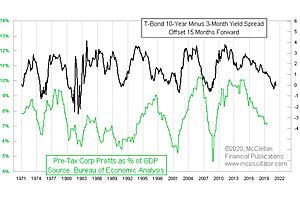 To help make the point about the economy lagging the yield curve, I have offset the 10Y-3M spread by 15 months, which allows us to better see how its movements show up again in the corporate profits data.