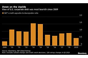 S&P Global Ratings was the most bearish on U.S. corporate debt in 2019 than at any other point in the last decade. Last year saw the most credit ratings downgrades for U.S. companies relative to upgrades since 2009, according to S&P data compiled by Bloomberg.