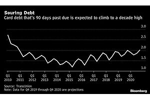 Americans are projected to fall seriously behind on their credit card bills at the highest rate in a decade as banks push a record number of people to get plastic.The share of credit card borrowers who are at least 90 days past due on their accounts will probably tick up to 2.01% next
