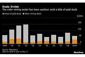 A torrent of deal-making among gold producers that’s pushed M&A in the sector to an eight-year high is seen spilling over into the wider mining industry -- if there’s a rally in global growth.Pending and completed gold acquisitions have reached about $33 billion so far in 2019, the highest...