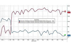 The divergence in sentiment between Democrats and Republicans remains vast but for the first time in six months, Democrats' confidence improved...