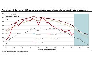 One of the historic indicators signaling the end of a business cycle (and an impending recession) is US corporate margin squeeze. Note the red line which is plunging towards recession.