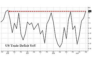 The US trade balance (deficit) shrank in September (from -$55.0bn to -$52.5bn), improving by 6.5% YoY - the biggest shrinkage in the deficit since Sept 2016...