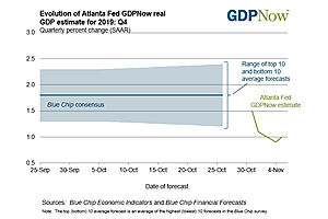 The GDPNow model estimate for real GDP growth (seasonally adjusted annual rate) in the fourth quarter of 2019 is 1.0 percent on November 5, down from 1.1 percent on November 1.