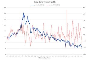 One of the main drivers of gold prices recently has been the plunge in long-term interest rates.