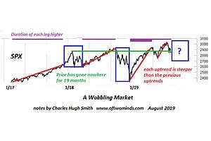 Consider this chart of the SPX (S&P 500) over the past two years: take a look at the relative steepness of each of the red lines (rallies), the duration of each rally (purple lines), the blue boxes (volatile spots of bother)...