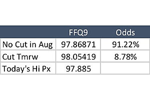At its most extreme this morning, I'd estimate the mkt was pricing in almost 10% probability of a 25bp cut by the Fed tomorrow. How do I figure? It's based on FFQ9 (August Fed Funds futures).