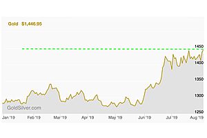 The gold market has ignited, with the price now at fresh highs for the year. As we write on Friday August 2, gold is trading at $1,446 per ounce. That represents a 13% year-to-date gain. The reasons for the spark aren’t difficult to identify. Trump unexpectedly announced a fresh round of tariffs on China yesterday. Gold immediately responded, while stocks abruptly sold off. The trade and currency wars between the US and China seem to have no definitive end in sight.