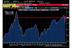 The Buffet Indicator, using the flow of funds definition of corporate equity, shows that the stock market is just below the dot.com bubble … and burst.