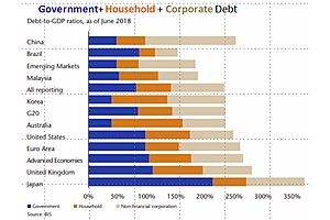 We estimate that official figures are understated by a factor of 2.5, so debt is actually $460 trillion, which is 560% of GDP and $215,000 per person.