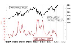 This week’s chart shows a 10-day simple moving average of daily trading volume in QQQ. This indicator has dropped to its lowest reading in almost 2 years, as prices have been pushing up to higher levels.