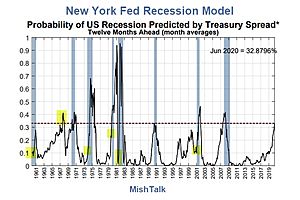 The New York Fed Recession Model is based on yield curve inversions between the 10-year Treasury Note and the 3-Month Treasury Bill.