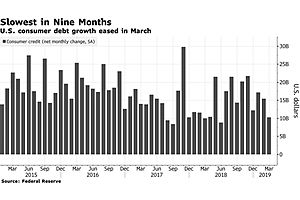 U.S. consumer debt growth eased in March with the smallest increase in nine months, suggesting Americans were less motivated to spend despite the strong labor market.