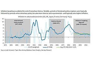 In both the late 1800s and from the 1990s to present day, the 10 year average inflation rate has been low. The key difference is it was much more volatile in the 1800s as there were several depressions.