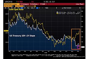 "The US Treasury 10Y-2Y slope just breached the 10 basis point barrier. And with that, gold is rising. Yes, we are on the inversion express. With gold as the protection. All aboard!"