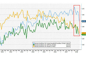 "Buying conditions for large household durable goods slipped to the lowest level in almost 4 years, vehicle-buying views were the least favorable since 2013, and home-buying conditions were seen less favorably than any time in about 10 years. Current conditions gauge fell to 107.8 from 114.4 in July; 6.6-point drop is biggest since Aug. 2011."