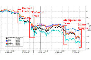 Another day, another leg lower in cryptocurrencies as FUD spreads, this time on the back of headlines exposing market manipulation during last year's meltup and collapsing margins for miners as prices tumble below breakevens.