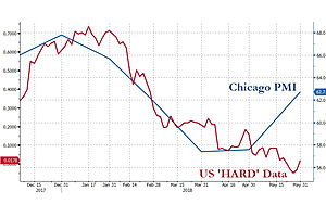 After tumbling through March and stabilizing in April, Chicago PMI rebounded in May printing a better-than-expected 62.7, despite the ongoing slump in 'hard' actual economic data.
