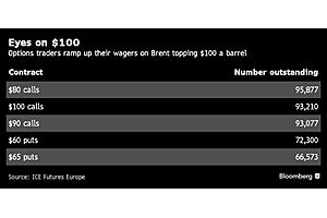 Whether it’s the specter of sanctions on Iran, Venezuela’s output plunge, or a momentum play on the back of the past year’s 46 percent surge in Brent, there are now the equivalent of about 93 million barrels wagering on the global benchmark hitting $100 at some point in the next 12 months.