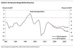 "The US fiscal outlook is not good. We project the federal deficit will increase from $825bn (4.1% of GDP) to $1,250bn (5.5% of GDP) by 2021. By 2028, we expect it to rise to $2.05 trillion (7.0% of GDP)."