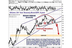 This chart, which is of a long T-bond proxy. It looks like it is on the point of breaking down from a giant head-&-shoulders top. If it does interest rates will soar....