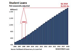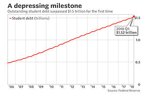 "Over the 10 years from Q1 2008 to Q1 2018, student loan balances soared by 146%, from $619 billion to $1.521 trillion."
