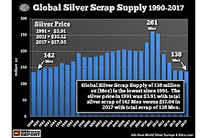 Global silver scrap supply fell to its lowest level in 26 years. World silver recycling in 2017 dropped by nearly 50% since its peak in 2011. According to the 2018 World Silver Survey, global silver scrap supply declined to 138 million oz (Moz) compared to 261 Moz in 2011. While the lower silver price is...