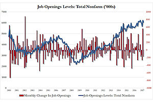 The latest JOLTS report showed an unexpectedly large contraction in the labor market, as the number of job openings dropped from a downward revised 6.228 million to 6.024 million, a 176K slide, as the series becomes increasingly volatile.