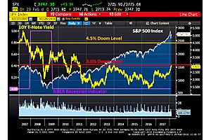 First it was PIMCO screaming "doom" if the 10-year Treasury note yield hit 3%. Now Goldman is screaming "doom" if the 10-year T-Note yield hits 4.5%. ‘Stress test’ outcome could sink S&P 500 to 2,155-2,298 range Measures outlier move vs Goldman’s 3.25% year-end scenario (Bloomberg) -- If the 10-year U.S. Treasury yield hits 4.5 percent…