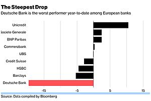 Deutsche Bank has now fallen 19.6 percent since the beginning of the year, by far the steepest drop in the Bloomberg 500 Europe Banks and Financial Services Index.