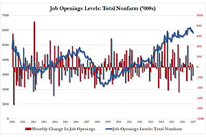 After a burst of record high job openings which started in June of last year and declined in the fall, today's December JOLTS report showed another modest drop in job openings from 5.978MM to 5.8113MM, below the 5.950MM consensus estimate, and the lowest print since May.