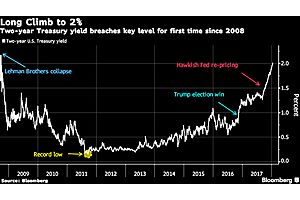 The two-year U.S. Treasury yield rose above 2 percent for the first time since September 2008, marking a rebound to a key psychological level last seen during the depths of the global financial crisis.