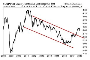 I keep reading articles claiming that inflation is nowhere to be found. If that is true, explain the following four charts. Copper has broken out of a 10-year downtrend. This chart suggests that Copper will be retesting its 2011 highs. Another inflationary industrial metal (steel) is posting a similar pattern. There is literally NOTHING bearish