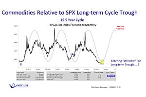 Commodities relative to Equities long-term cycle TROUGH 15.5-year cycle.Please click on the image below to see a larger view;