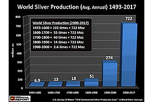When Columbus arrived in America (1492), the world was only producing 7 million oz of silver a year. Today, the world's largest primary silver mine, Fresnillo's Sauicto Mine, produced three times that amount in just one year (22 million oz, 2016).