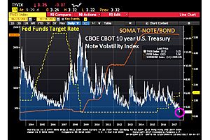 Vol Repression: The CBOE CBOT 10 year U.S. Treasury Note Volatility Index (TYVIX) just hit its second-lowest level in history today. The lowest was last Friday, 12/15/17. We know that the 10-year T-Note premium co…