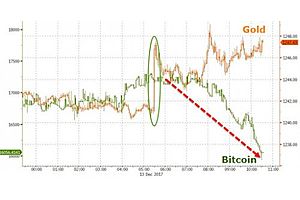 The day's slide started around 9amET, when a burst of gold buying appears to have reset the correlation between XAU and BTC: