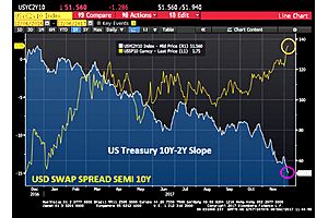 The US Treasury 10Y-2Y curve continues to go down (flatten). It has now hit 51.56 BPS. The USD Swap Spread 10Y keeps on rising.