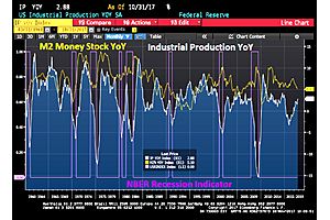 The Fed is printing currency (M2) at a rate almost twice as fast as Industrial Production growth.